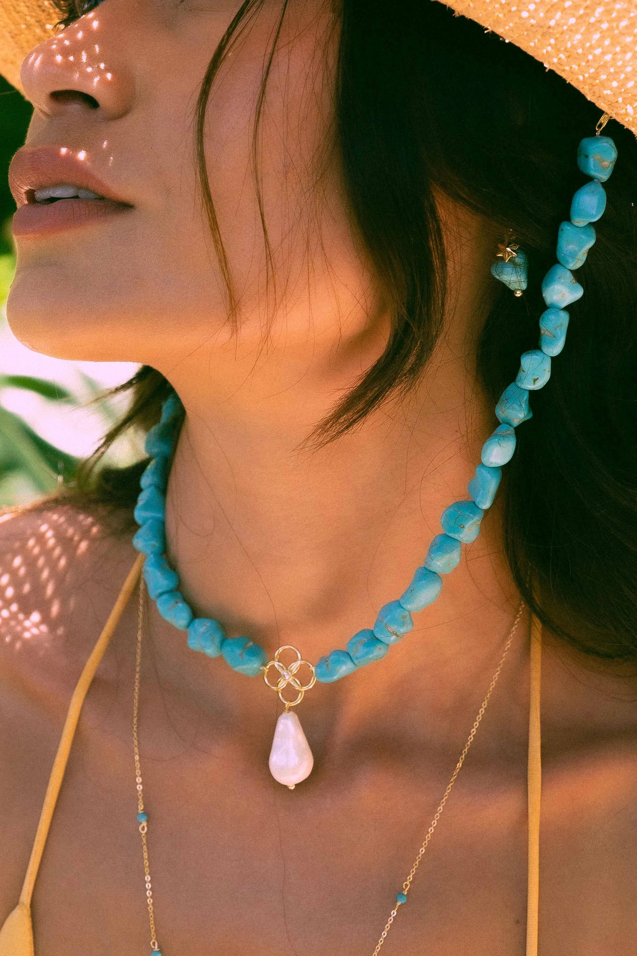 This necklace is hand-strung with soul-soaked natural turquoise stones, met with a twisted crystal embedded emblem in 22k Gold plated sterling Silver and an irregular freshwater Baroque pearl.