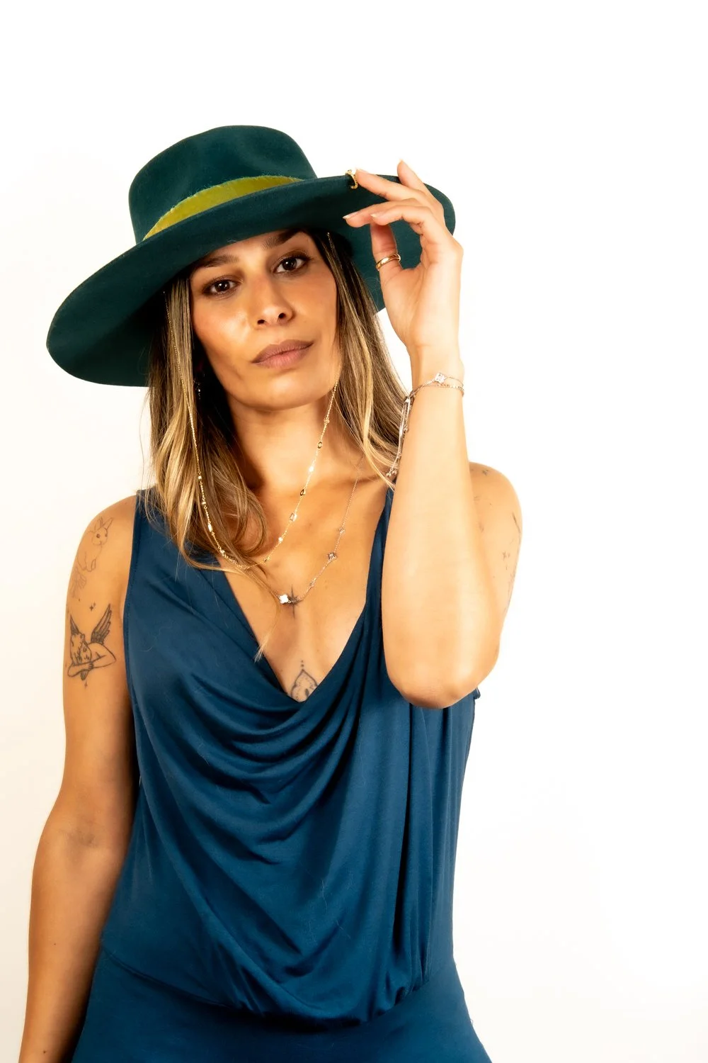 Featuring all 22K Gold Plated Sterling Silver accessories, including a detachable necklace that can be worn on the hat or neckline.